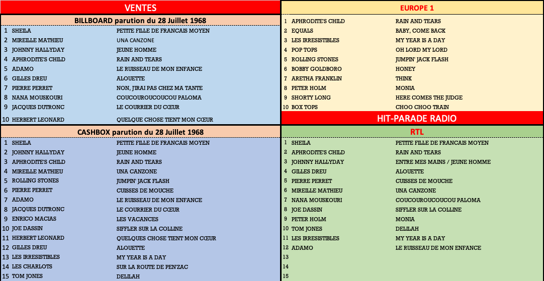 3 entrées : Meilleure entrée Dalida 25è , Claude François 29è , Enrico Macias 34è et Antoine qui revient 37è